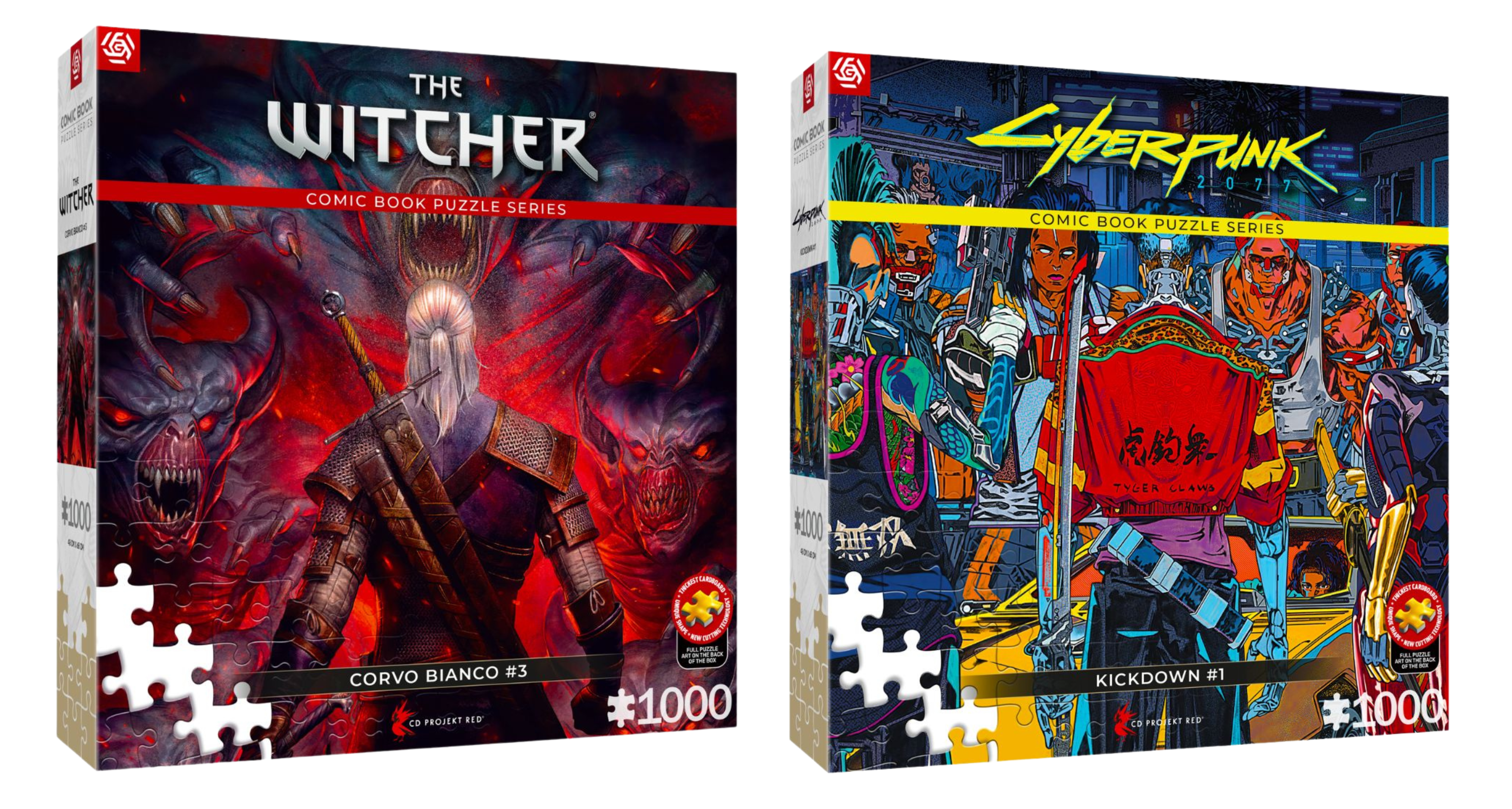 Premierowe wzory puzzli z serii Comic Book Puzzle inspirowanych komiksowymi historiami z uniwersów Wiedźmina oraz Cyberpunka 2077.