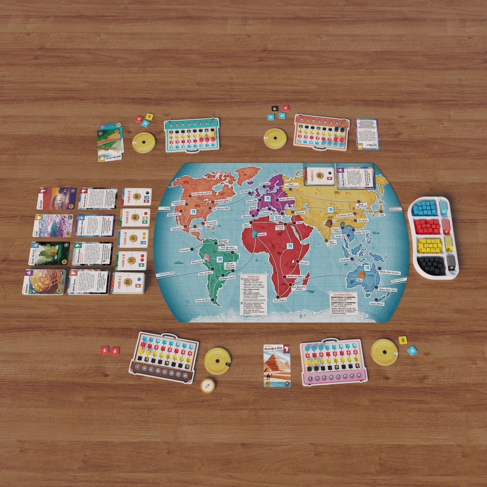 - Zdobyte pamiątki umieszczamy w naszych walizkach, zaznaczając postęp za pomocą specjalnych kostek. Równomierne uzupełnianie kolumn pozwala na zdobywanie punktów, a przykrywanie konkretnych pól zapewni nam usprawnienia w postaci żetonów planu podróży.