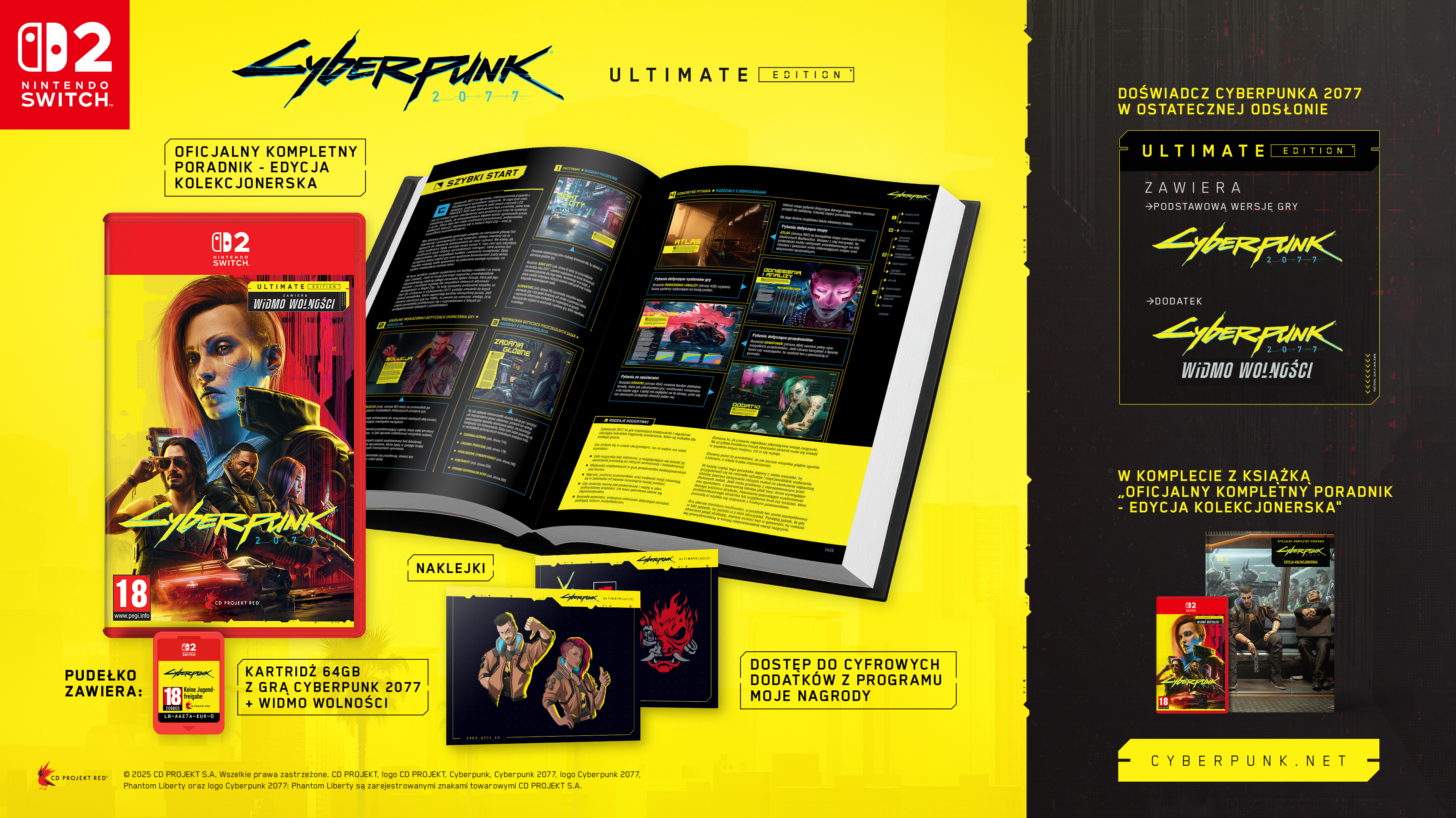 Pudełkowe wydanie Cyberpunk 2077: Ultimate Edition składa się z pełnej wersji gry oraz dodatku Widmo Wolności w całości na kartridżu, oficjalnego kompletnego poradnika oraz naklejek.