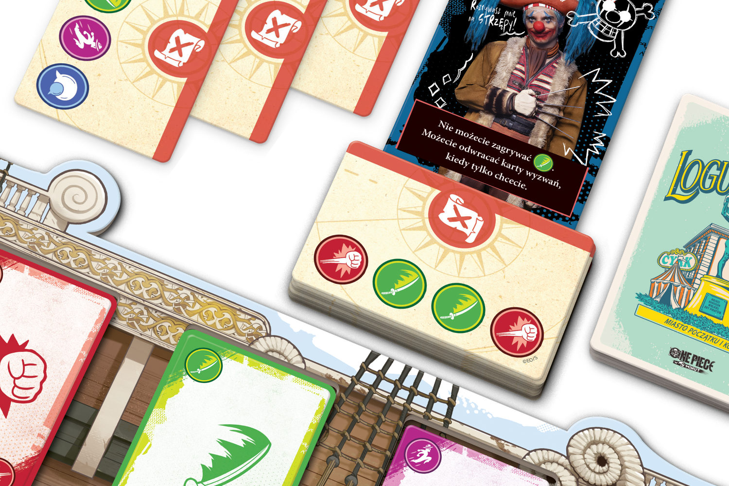 - Karty wyzwań to specjalna talia umieszczona poniżej talii przygód. Aby ukończyć kartę wyzwania, musimy zebrać wskazany na niej zestaw symboli – istotny jest zarówno ich rodzaj, jak i kolejność ułożenia. W tym celu będziemy zagrywać karty z ręki na planszę Going Merry, a także przemieszczać je dzięki rozmaitym efektom.