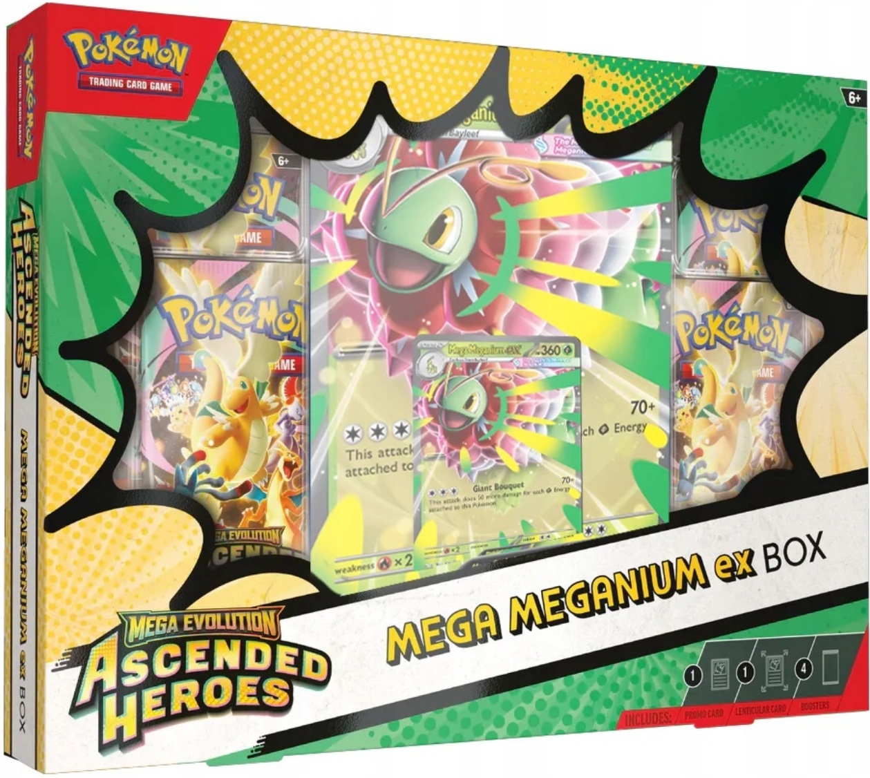Pokémon TCG: Mega Evolution - Ascended Heroes - Mega ex Box znajdziesz Mega Pokemona ex jako grywalną kartę promo foil, a także powiększoną kartę lentikularną z dynamiczną grafiką oraz cztery boostery ze specjalnego dodatku Mega Evolution - Ascended Heroes.
