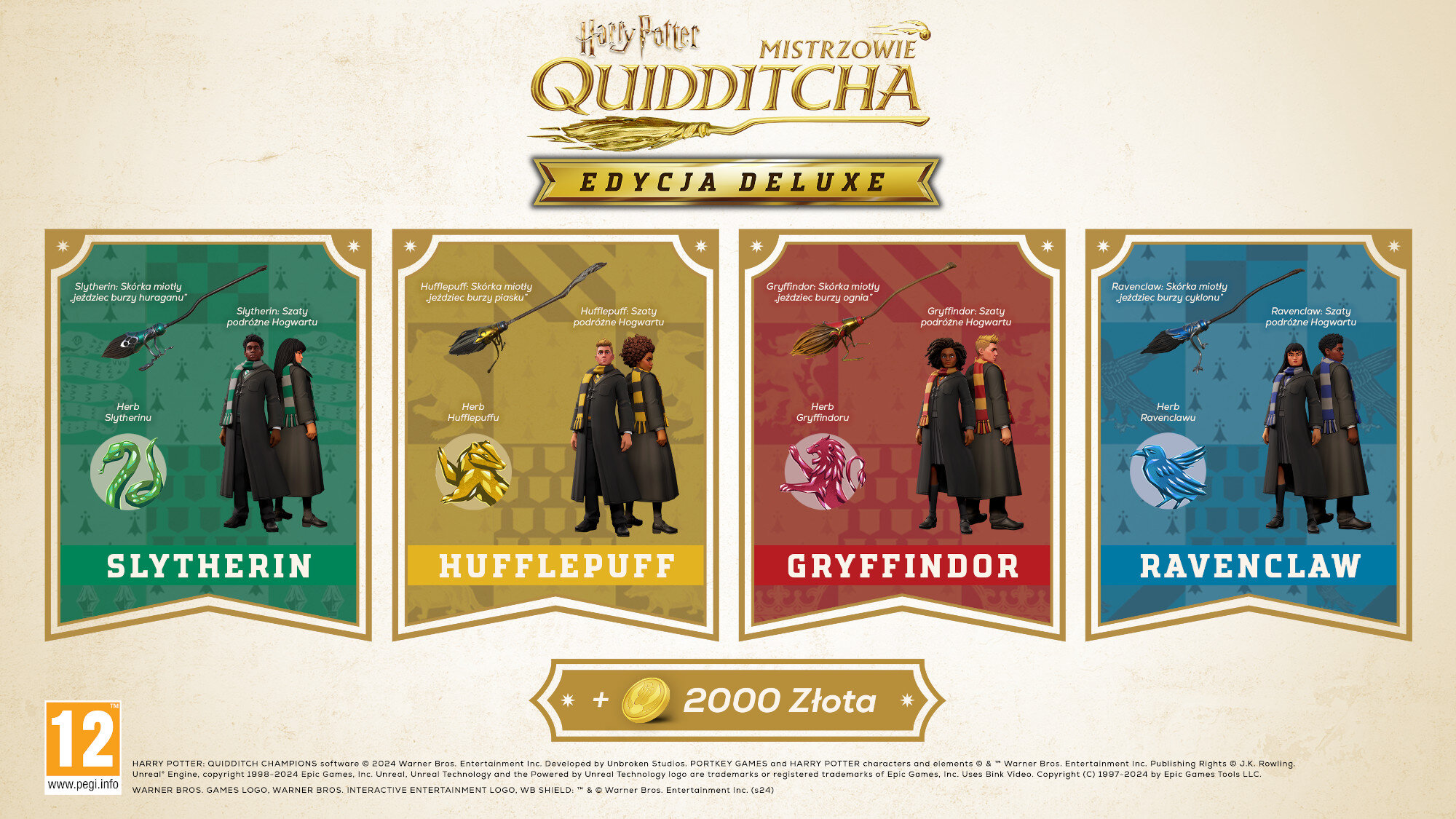 Harry Potter: Mistrzowie Quidditcha Edycja Deluxe to idealna okazja, aby zanurzyć się w magiczny świat Quidditcha. Edycja Deluxe zawiera unikalne skórki mioteł, wyjazdowe mundurki szkolne oraz herby wszystkich czterech Domów Hogwartu: Slytherinu, Hufflepuffu, Gryffindoru i Ravenclawu. Graj samodzielnie lub ciesz się emocjonującą rozgrywką z rodziną i przyjaciółmi!